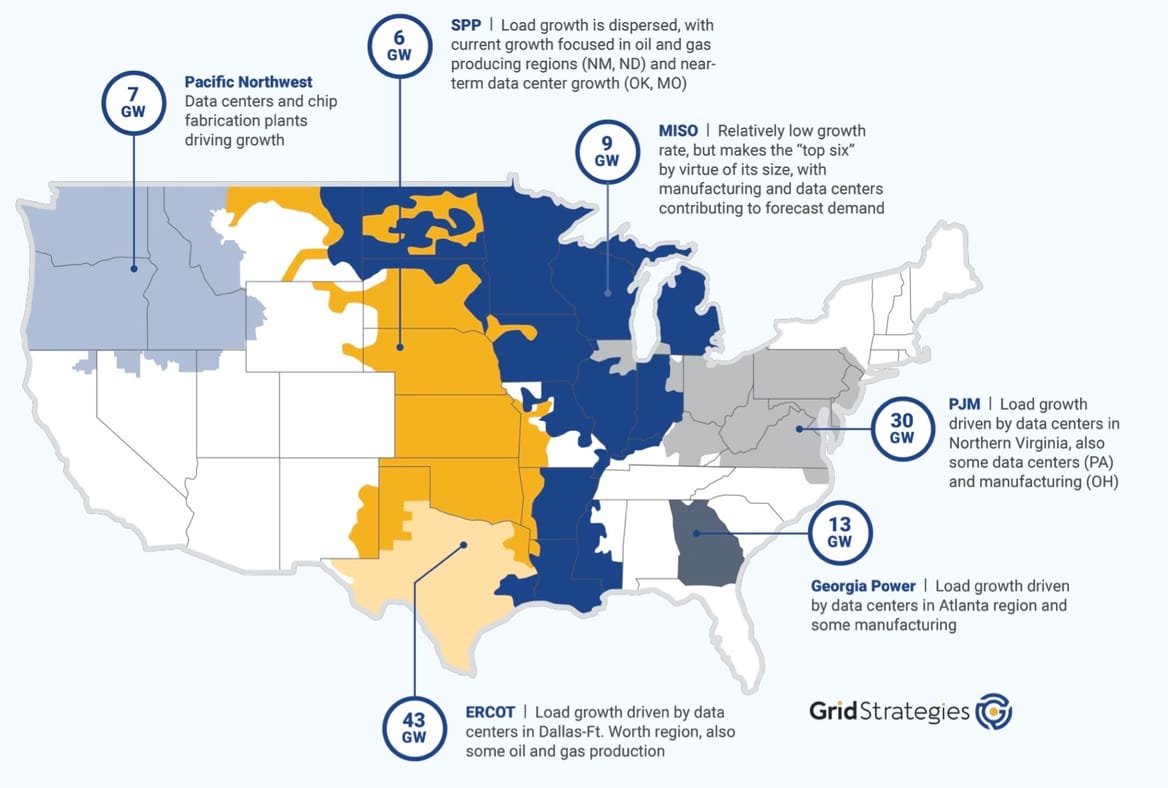 A December report from consultancy Grid Strategies tracked enormous load-forecast growth in data center hot spots, from northern Virginia’s “Data Center Alley,” the world’s densest data center hub, to newer boom markets in Georgia and Texas.